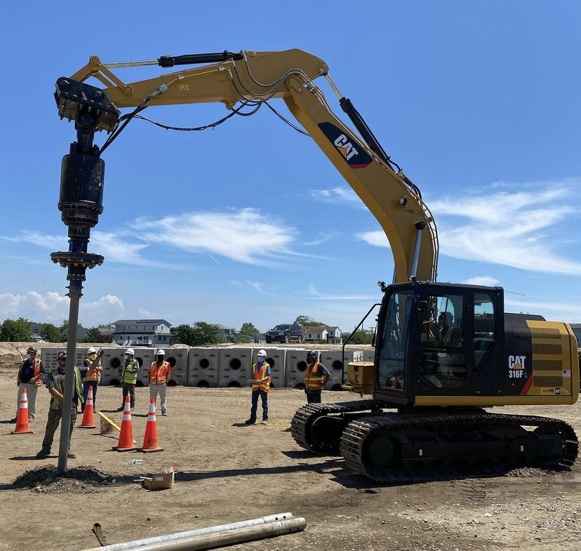 Helical piles do not auger soils to the surface. There are no hauling or disposal costs for evacuated dirt. See pictures of helical Pile installation below.